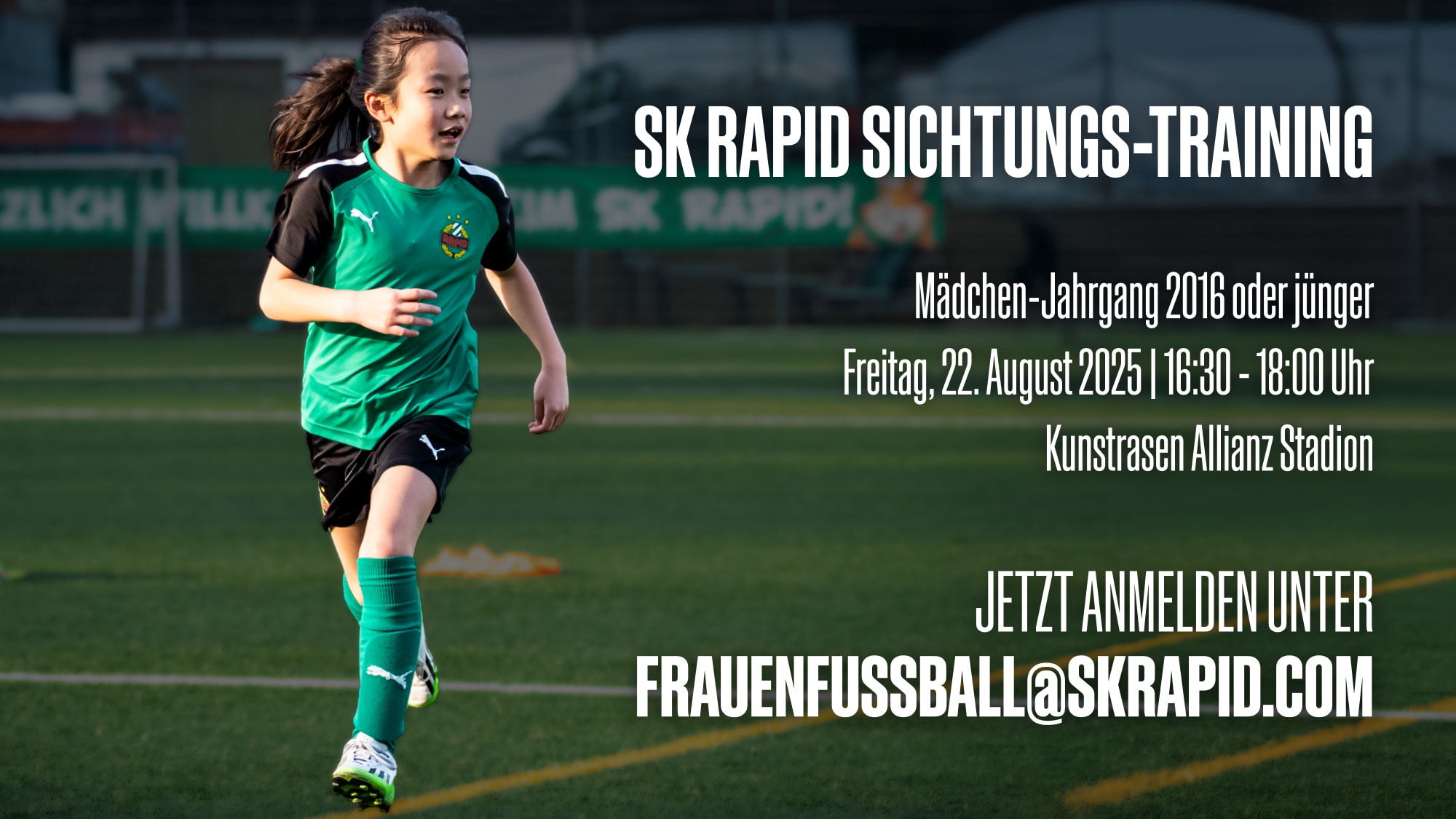 Am Freitag, 22. August lädt der SK Rapid interessierte Mädels der Jahrgänge 2016 und jünger zu einem weiteren Sichtungs-Training ein.