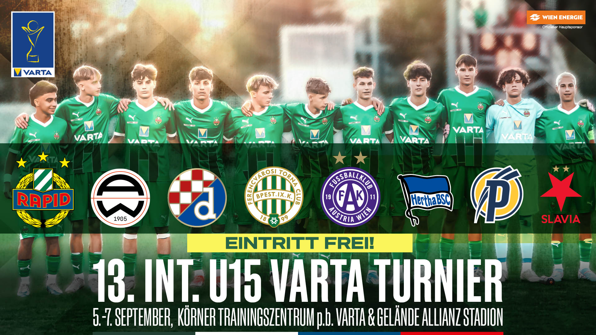 Das SK Rapid U15 VARTA-Turnier geht in die nächste Runde. Auch heuer treten wieder acht Teams zum internationalen Leistungsvergleich an. Gespielt wird von Freitag, 5. September 2025 bis Sonntag, 7. September 2025 – der Eintritt ist frei. ACHTUNG: Aufgrund des Testspiels der Kampfmannschaft am 5. September gegen Venezia im Allianz Stadion, findet der erste Tag des VARTA-Turniers, also der Freitag, im Körner Trainingszentrum powered by VARTA statt. Die anderen beiden Tage werden wie gewohnt bei den Trainingsplätzen in Hütteldorf abgehalten.