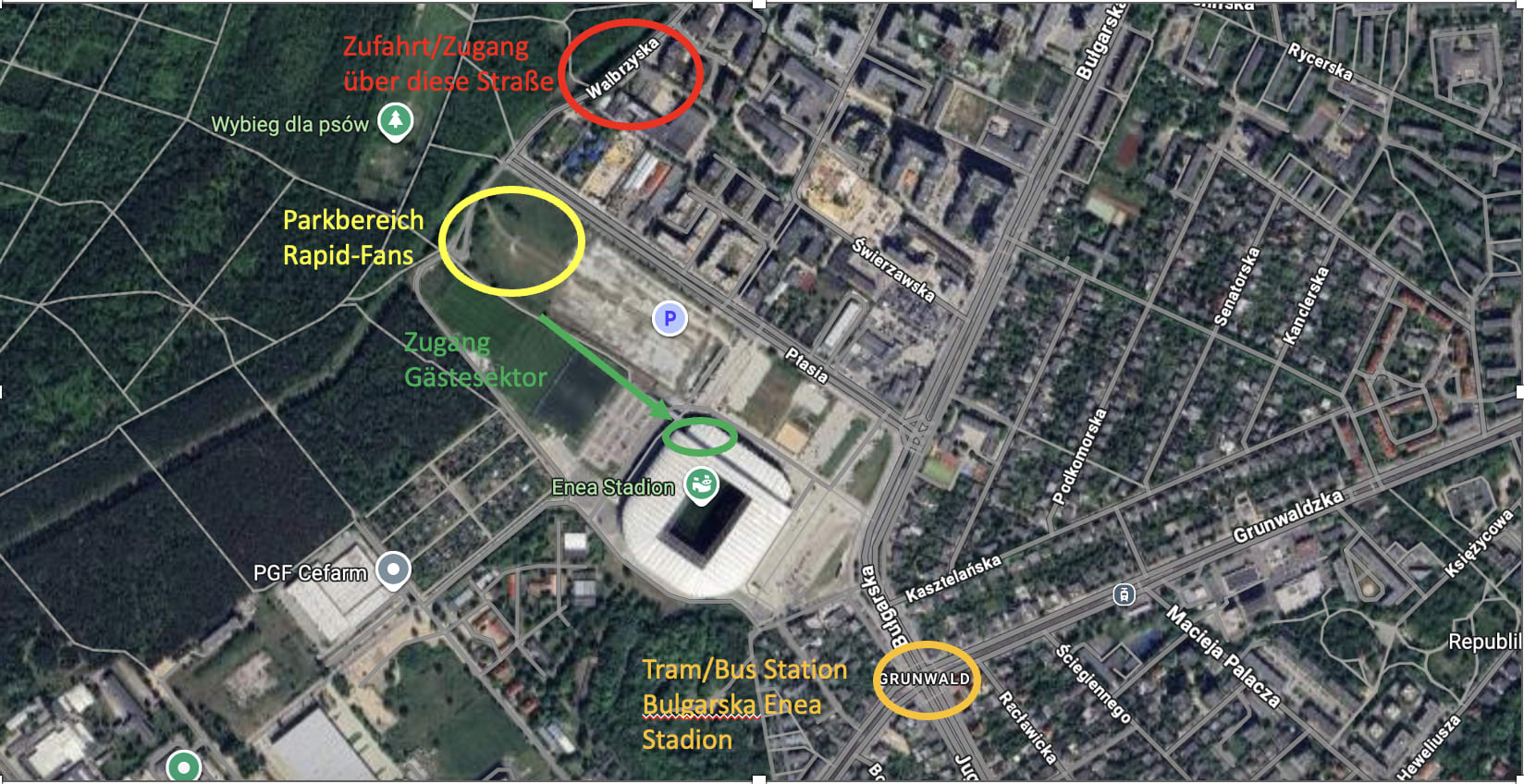 Der Zugang zum Gästesektor in Posen ist, wie in der Skizze ersichtlich, über die Straße "Wałbrzyska" (siehe Skizze) möglich. Direkt vor dem Eingang zum Gästesektor gibt es einen großen Parkplatz für PKWs und Busse, ausschließlich für Rapid-Fans. Der Parkbereich öffnet ab 3 Stunden vor Spielbeginn.