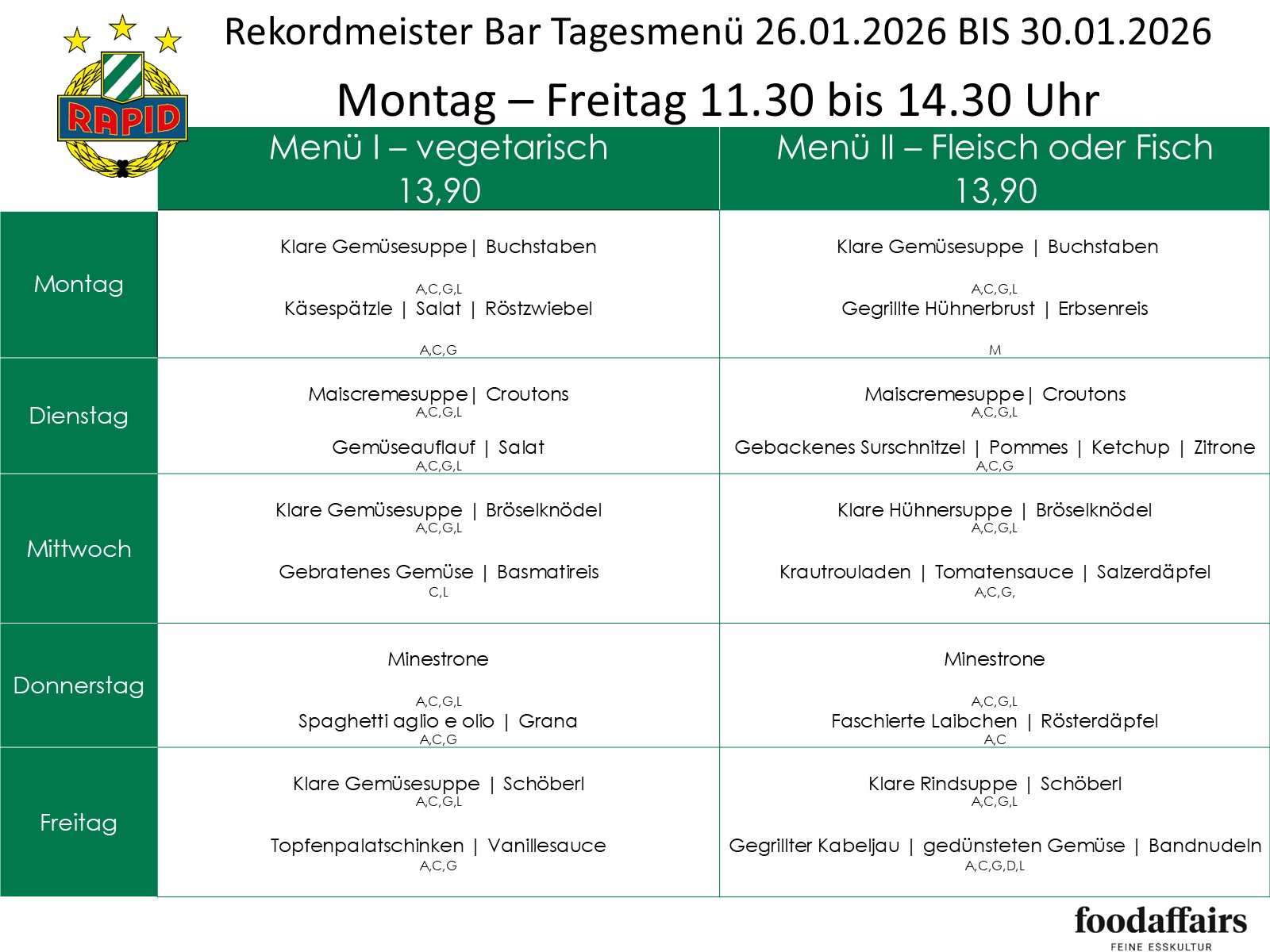 Menüplan Rekordmeister Bar vom 26. bis 30. Jänner 2026
