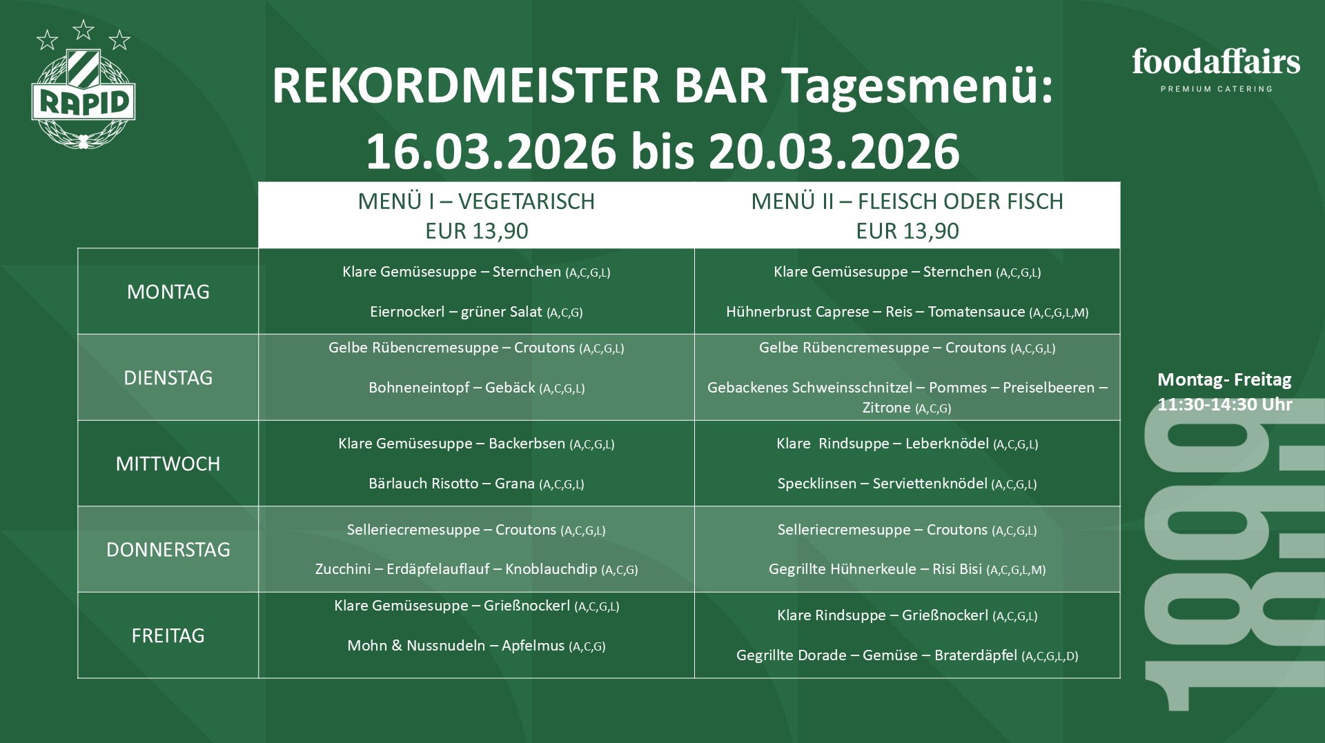 Nachfolgend findet ihr den Menüplan für die aktuelle Woche in unserer beliebten Rekordmeister Bar in der dritten Ebene des Allianz Stadions. Der Zugang ist direkt über dem Eingang beim großen Wappen am Gerhard-Hanappi-Platz möglich, die Öffnungszeiten lauten wie folgt:
