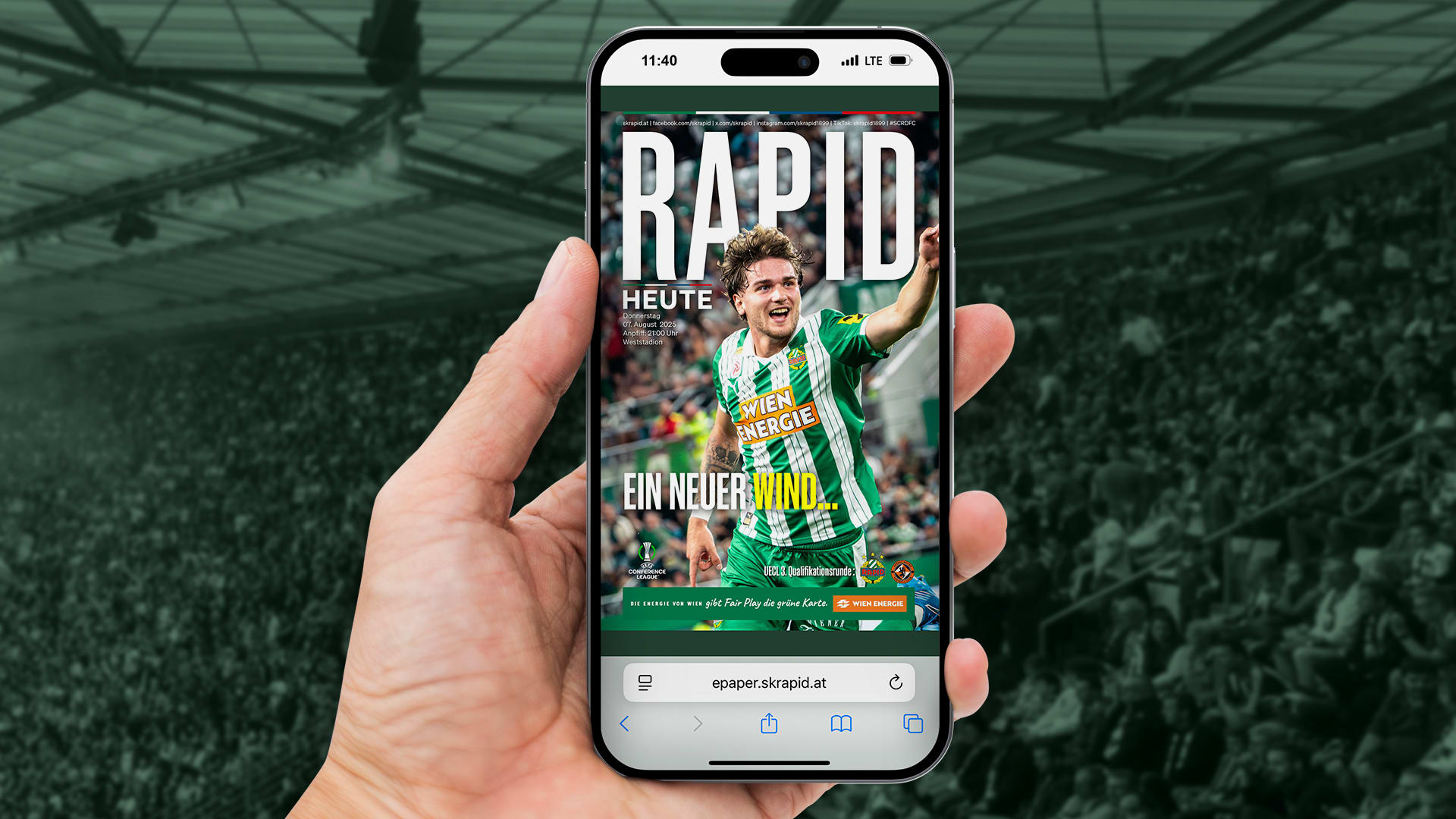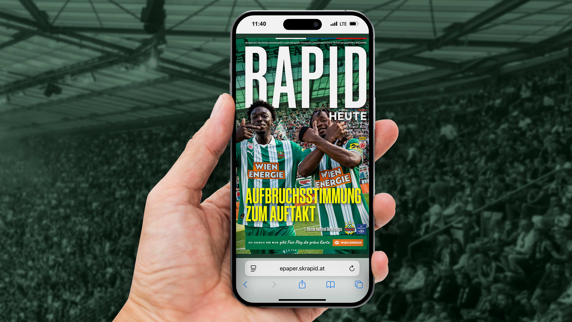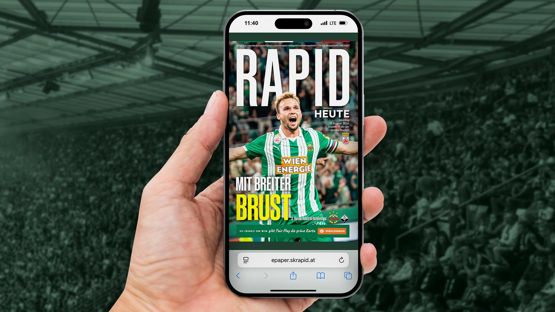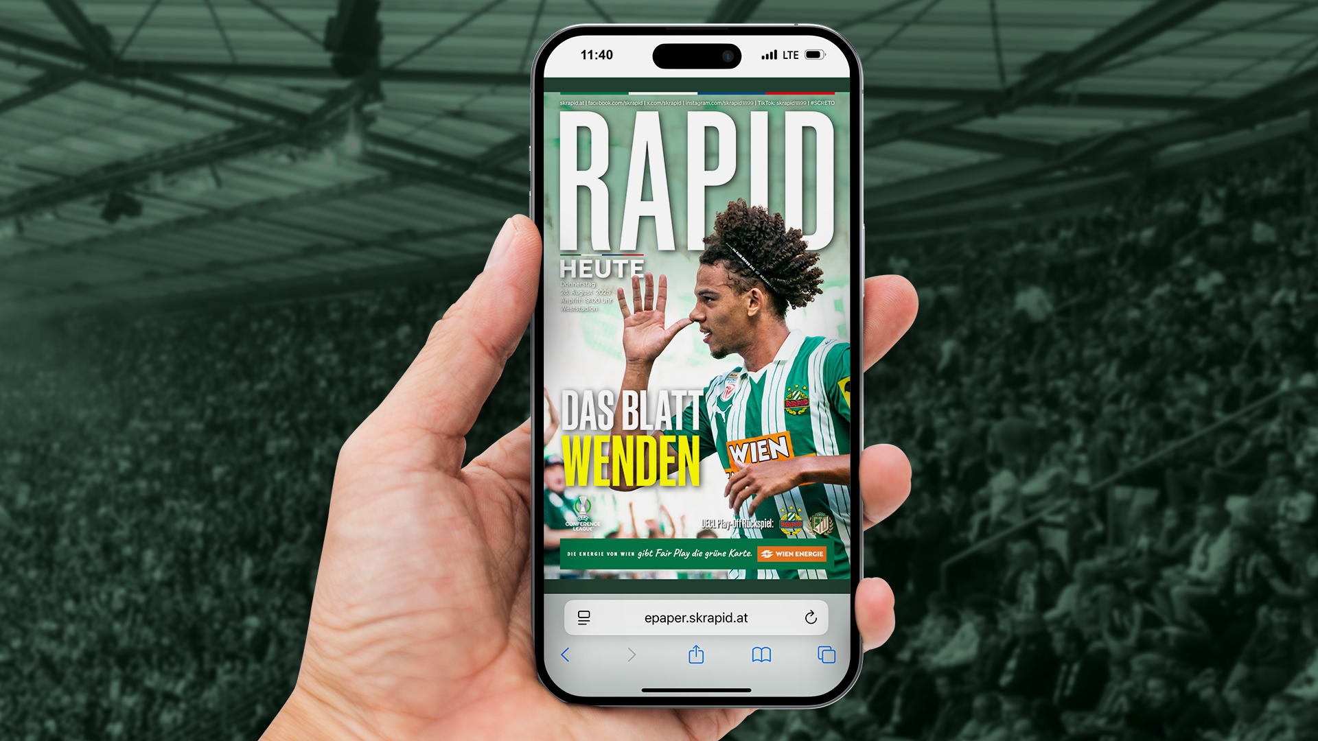 Unsere Stadionzeitung "Rapid Heute" erscheint zu jedem Heimspiel und ausschließlich nur mehr digital als E-Paper (auch als PDF zum Download). Alle App-User bekommen am Spieltag via Push-Benachrichtigung die neueste Ausgabe der Stadionzeitung direkt auf das Handy. Auf dieser Seite findest du alle bisherigen Stadionzeitungen zur aktuellen Saison, sowie ältere Ausgaben archiviert. Klicke direkt auf das Titelblatt bzw. den Titel, um die gewünschte Stadionzeitung im Browser anzusehen.