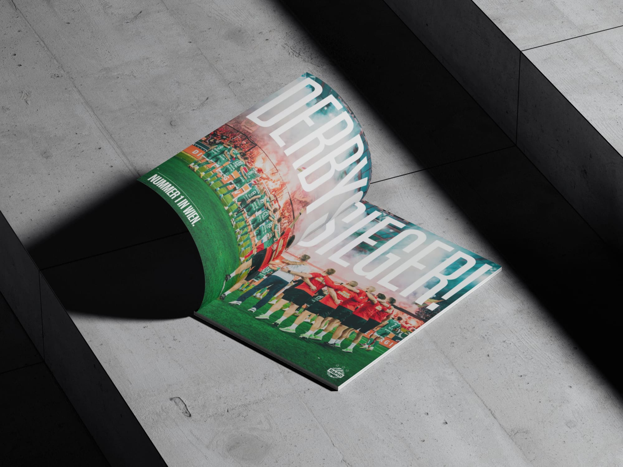 In Kombination mit 45°-Schrägen aus dem Wappenschild bildet die Rapidviertelstunde ein ikonisches grafisches Feld, in dem das Wort „RAPID“ nicht typografisch geschrieben, sondern strukturell spürbar wird. Es ist Hintergrund und Haltung zugleich – und kommt genau dort zum Einsatz, wo Rapid am stärksten wirken soll.