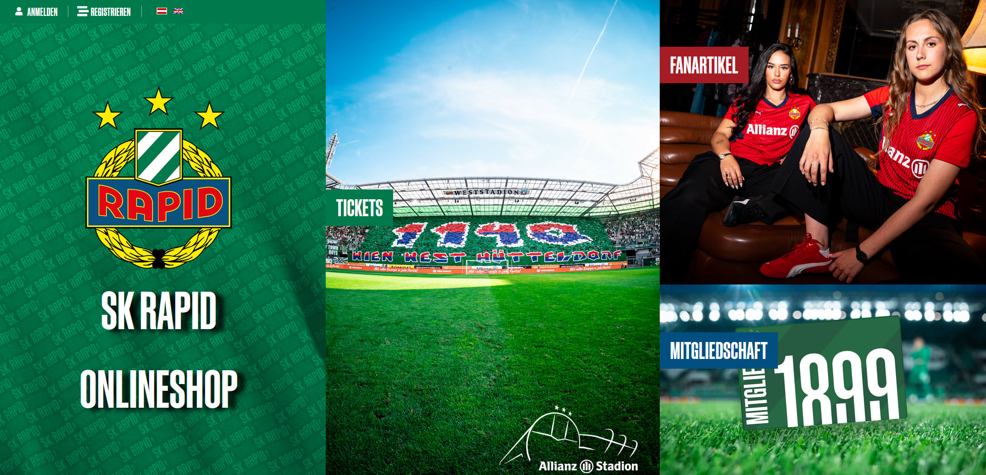 Im Herzen unserer Heimat findet ihr unseren 350m2 großen Fanshop, direkt in die "Röhre" des Allianz Stadions eingebettet. Dort haben wir alles, was das grün/weiße Rapidherz begehrt.