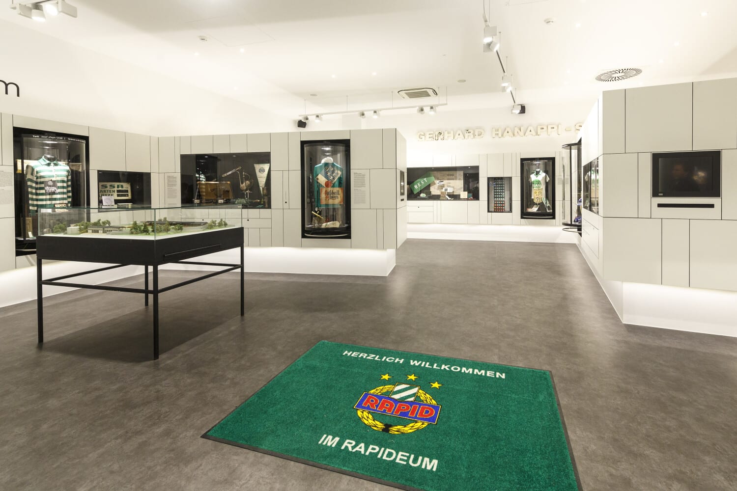Dieser Spruch steht an der Wand der Spielerkabine des SK Rapid geschrieben. Nur einige Schritte neben der Kabine liegt das Rapideum, in dem diese Geschichte lebendig wird. Auf 165 m² warten die unterschiedlichsten Erinnerungsstücke darauf, entdeckt zu werden. Der präsentierte Bogen spannt sich von der Gründung des 1. Wiener Arbeiter Fußball-Clubs im Jahre 1897 bis in die Gegenwart. Neben 31 klassischen Vitrinen, vier Video-Stationen und zwei originalgetreuen Stadionmodellen laden 59 versteckte Laden und Kästen dazu ein, in die Klubgeschichte einzutauchen. Dabei gibt das Motto Gemeinsam. Kämpfen. Siegen. die thematische Ausrichtung vor.
