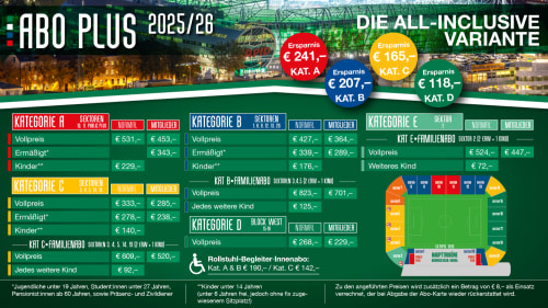 ABO PLUS: Mit der Variante „Abo Plus“ hat man außerdem einen Fixplatz für mögliche Entscheidungsspiele im Allianz Stadion im Bundesliga-Play-Off um einen Startplatz im internationalen Bewerb inkludiert. Zusätzlich reservieren wir automatisch den Sitzplatz bei etwaigen Heimspielen im ÖFB Cup, sowie bei internationalen UEFA-Bewerbsspielen. (All jene Rapid-Fans, welche ihr Abo Plus für die kommende Saison bereits automatisch verlängert haben, wird der Abo-Beitrag Anfang Juni vom angegebenen Konto abgezogen und die Abokarte im Laufe des Monats zugesendet!)