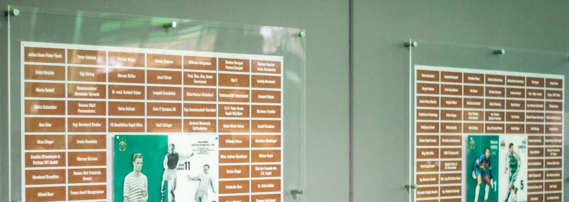 Nachdem die ersten Tafeln prominent an den Wänden des Gerhard Hanappi-Stadions hingen, haben wir uns entschlossen, diese auch im neuen Stadion sichtbar zu machen und so findet ihr die bisherigen Legenden-Tafeln in der Promenade des Allianz Stadions neu platziert.