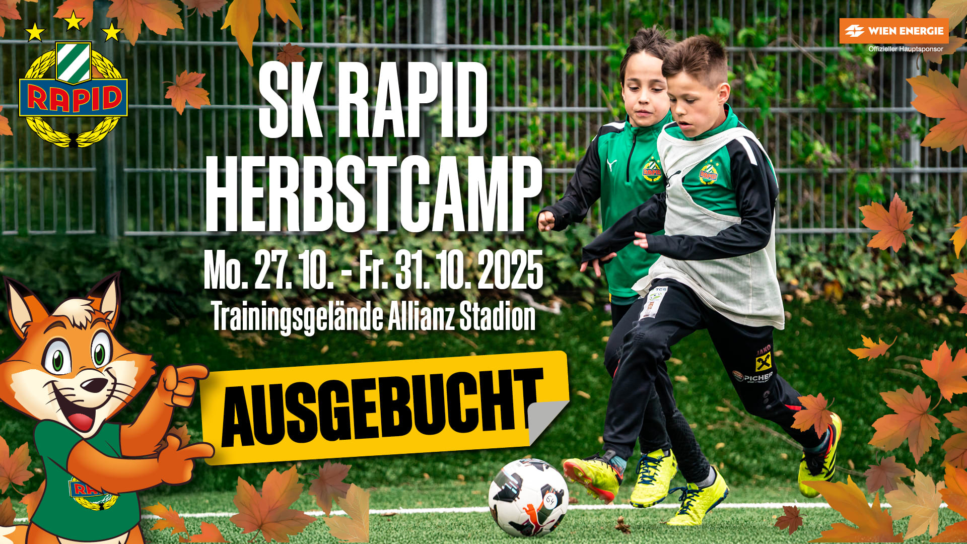 Mit Ende der erfolgreichen Fußball-Camp-Saison im Sommer 2025, bei der wieder rund 600 fußballbegeisterte Kids mit dabei waren, dürfen wir euch den bereits fixierten Termin für das diesjährige SK Rapid Herbstcamp präsentieren. Wir laden alle Burschen und Mädchen im Alter von 7 bis 14 Jahren dazu ein, in den Herbstferien (27.10. - 31.10.2025) bei unserem Fußball-Camp in Wien-Hütteldorf mit dabei zu sein.