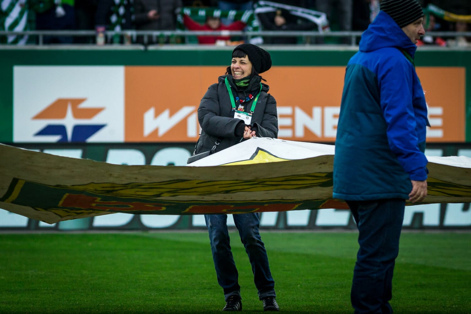 Dann geht es nach einer kurzen Erklärung des Ablaufs gemeinsam ins Stadion. Danach haben alle Teilnehmer die Gelegenheit, Fotos vom Aufwärmen von Rapid zu schießen und auf der Haupttribüne Platz zu nehmen. Kurze Zeit später werden das Gründungswappen und das aktuelle Wappen während der Rapid Hymne von unseren Mitgliedern auf das Spielfeld getragen.